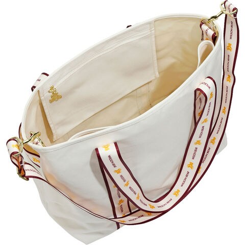 人気の ONE BEAR シリーズのキャンバストートバッグが装い新たに登場.大容量の収納部にはアパレルやシューズ等を収納可能.内部背面部にはラケットを 2 本収納可能な仕切りを用意.内部前面部にはベアのチャームがあしらわれたジッパー付のポケットがあり、小物の収納に最適.フロント部には 3 室に仕切られたポケットが用意され、小物を収納してもらえます.取り外し可能なストラップは長さの調節も可能であり、肩掛けはもちろん斜め掛けとしても使用していただけます.