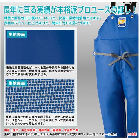激しい動作を要求される水産関係のプロのための本格ウエア.ひとつひとつ性能をより高め、求められる様々な高機能の複合化を実現.軽量で動作性にも優れているので、快適に長時間着用できます.表面はフラット仕上げなので、簡単に汚れを落とせます.