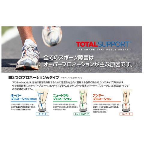 特徴:かかと部分の3つに分かれたクッションは、赤色の部分が少し硬く、足首が過度に内側へ傾くオーバープロネーションを防ぎます.前足部には足の形状に沿って配置されたSpencoreフォアフットクラッシュパッドが、蹴り出しをサポート.