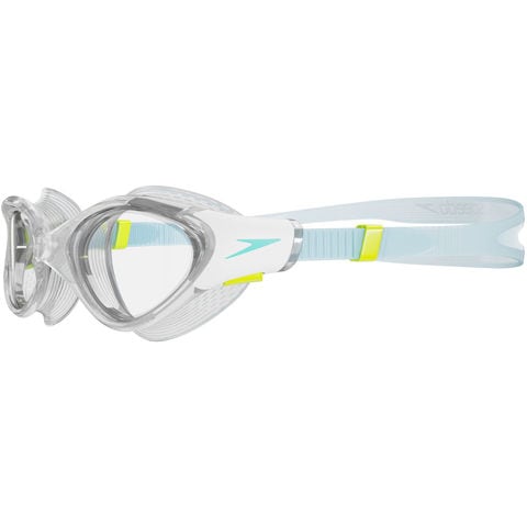 人間工学を踏まえて開発されたBiofuseシリーズの女性向けフィットネスゴーグル.女性の顔に合わせてデザインされたスタイリッシュな[SHAPED CAT EYE(キャットアイフレーム形状)]フレームを採用.なめらかな形状で、鼻と顔の輪郭に合わせて心地よくフィットします.さらに、フレーム内側にもくぼみデザインの非常に柔らかなクッションをほどこし、目のまわりの密着度を高めています.UVカットレンズで紫外線から目を守ります.Speedo独自のくもり止め技術で効果が長く持続.ストラップはサイドのボタン一つで簡単に調節が可能です.