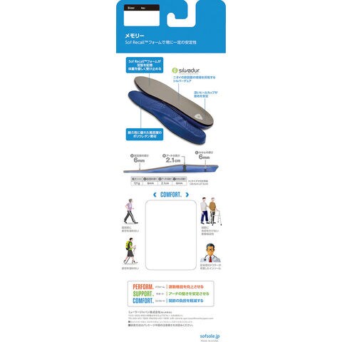 特徴:低反発のSof Recallフォームが足にしっかりとフィットし、体重を優しく受け止めます.深めのヒールカップが安定性を高め、足をしっかりサポート.ボディーは耐久性に優れた高密度ポリウレタン素材を採用.表面は抗菌防臭機能のあるSilvadurを採用.