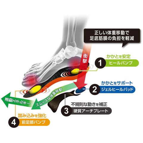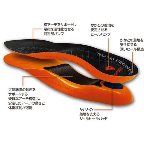 特徴:耐久性に優れたアーチプレートが足底筋膜をサポート.ヒールカップは、足部をコントロールし安定性を高めます.かかと部分のジェルが衝撃を吸収.