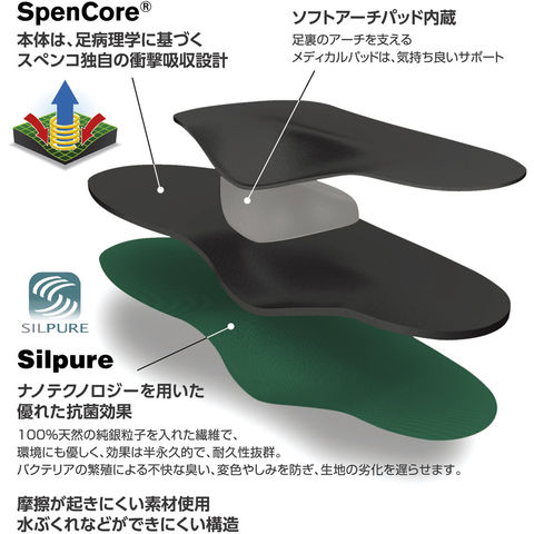特徴:アーチクッションが、しっかりとアーチを支えて足部の安定性を高め、疲労軽減をサポート.ボディーは、独自のクッション素材Spencoreを採用、固い路面での歩行時の衝撃を吸収し、疲労軽減をサポート.