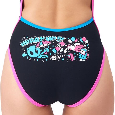 トレーニングカテゴリー[TOUGHSUITシリーズ].大会に向けて練習を重ねる頻度が高いスイマーにオススメの練習用水着.環境に配慮したリサイクルポリエステル素材[タフスキンE]を使用し塩素に強く長持ち.アリーナくんと仲間たちがプリントされた人気のHURRY UPデザイン.今回はシーズンテーマである[天気]をモチーフにした4つのストーリーを展開.デザインは胸元に大きめプリントとお尻に大きめのプリントのものと2種類用意.ストーリー性と遊び心たっぷりの、見ても着ても楽しいシリーズ.前当て部分に黒の裏地付き.ワンピースタイプ.