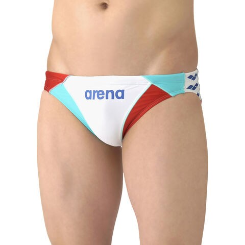 サイドにアリーナロゴを配置しスポーティーなデザインのブリーフタイプの水着.アリーナロゴをイメージした切替えで、カラフルでありながら高級感のあるデザイン.前身頃と後身頃に黒の裏地付き.※こちらの商品は返品、交換はお受けしかねますのでご了承ください.