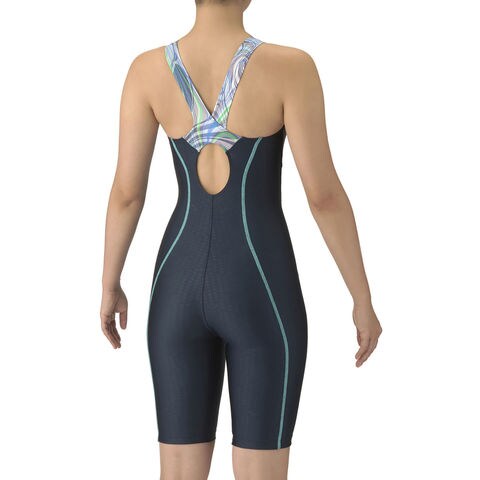 【 AQUA EXA- アクアエクサ】[泳ぎやすさ]を追求したフィットネス水着、 AQUA EXA( アクアエクサ ) シリーズ.上達を目指すフィットネススイマーにおすすめ.あきの少ないオープンバックタイプで、背中の露出を抑えつつ、水が抜けるため泳ぎやすい.膝上まで生地があるハーフレッグ丈で、脚の露出を抑えるため、安心感を求める方におすすめ.大きく開いて着脱がしやすい[着やストラップ]搭載.はっ水生地を使用しており、シャープな水きれで軽い泳ぎ心地が特徴.パッドは[ぴったりパッド]を使用しており、水着に縫い込まれているため、水の中でもズレにくくフィット感を重視する方におすすめ.エンボス生地を使用し、さりげない地模様がボディーラインをカバー.肩・