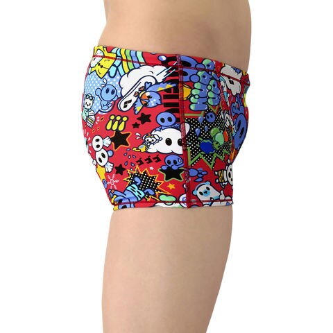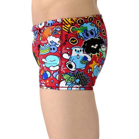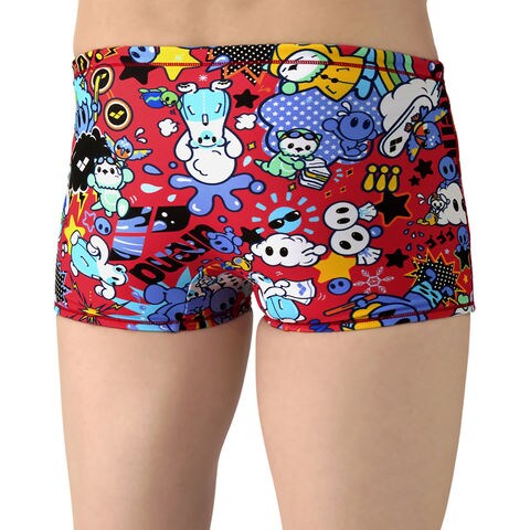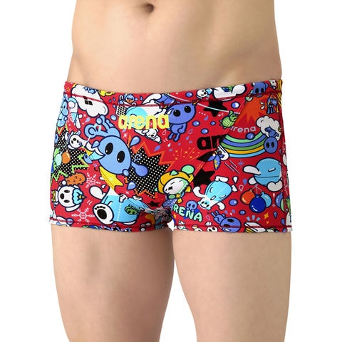 トレーニングカテゴリー[TOUGHSUITシリーズ].大会に向けて練習を重ねる頻度が高いスイマーにオススメの練習用水着.環境に配慮したリサイクルポリエステル素材[タフスキンEP]を使用し塩素に強く長持ち.全てのスイマーに人気のアリーナくんシリーズ.シーズンテーマである[天気]と連動するデザイン.アリーナくんと仲間たちの楽しい日常を、天気をテーマに描いたストーリー仕立て.明るいカラーリングと、POPでダイナミックな柄がポイント.前身頃、後身頃共に黒の裏地付き.ショートレッグタイプ.※この商品は縫製上、一点一点プリント柄の見え方に違いが生じますので予めご了承ください.