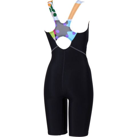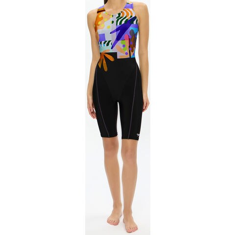 ゆったりしたフィット感で自分のペースで泳ぎたい方向けの[ LOOSEN( ルースン ) ]シリーズ.縦横自由に伸びて着脱もスムーズ.トレーニング中も心地よくフィットしてズレにくい、環境配慮型素材[ ULTRA STRETCH 0( ウルトラ・ストレッチ・ゼロ ) ]採用のレディースニースキンです.露出を抑えた小さな背穴、食い込みにくい幅広の肩ストラップを採用.透けにくく安心感のある厚みと、前身頃プリント生地裏には水はけのよいメッシュ素材の裏地、シャドーライナーをつけ、前身頃の透け軽減と程よいフィット感をプラス.着脱時のもたつきが少なくズレにくく動きやすい、縫い込み式のカップ付き.クロッチ部分には肌あたりのよい柔らかな素材を使用しています.股下はハギ・