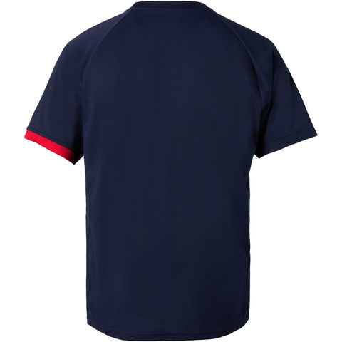 袖先の配色がデザインポイントのバレーボール用ゲームシャツです.バレーボールに特化した設計を採用しています.具体的には 1. 肩甲骨部分のストレスを軽減するため、脇下から肩甲骨部分にゆとりを持たせつつ、背面を 1 枚構造にしています. 2. ネットタッチ防止のため、裾を従来よりスリムな設計にしています. 3. 腕の振り上げ時に裾が上がってきてしまう点を軽減するため、裾を長めに設定しています. 4. フライングレシーブの際、骨盤部分の当たりを軽減するため、切替を後ろに振った設計にしています.