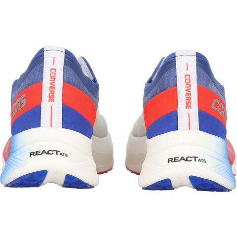 コンバースのランニングレーベル[ CONVERSE RUNNING ]のランニングを楽しむパフォーマンスモデル.ランニングエバンジェリスト[三津家 貴也]さんの意見を随所に取り入れたサブ 3-4 ランナー向けのトップモデル.三津家さんが推奨する、ミッドフット走法に適したラストと軽量で反発性の高いソール設計を採用.超軽量メッシュを使用し軽さと通気性を兼ね備えたアッパー.[ REACT ATS ]と[ガイディングカーボンプレート]がクッション性と走行時のブレを抑え正しいフォームをサポート.通気性とクッション性に優れたオープンセル構造のウレタンカップインソールを採用. REACT ATS (REACT AUTOMATIC STABLE) …硬度の異なる 2 種類の E.V.A. 素材を組み合わせたダブ・