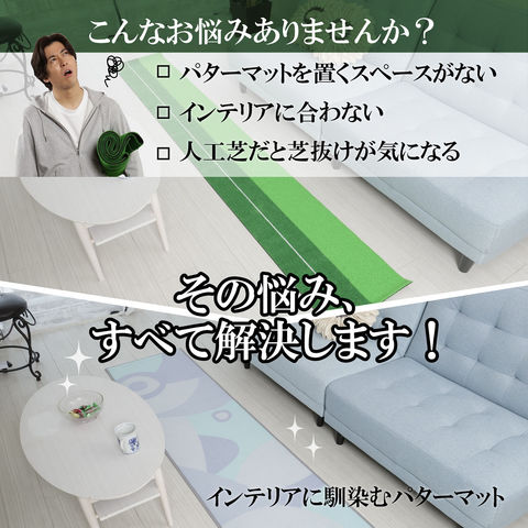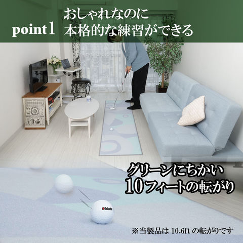 おしゃれな部屋に グリーンのパターマットは似合わない.そんなあなたのための[絨毯のようにインテリアに馴染むパターマット]が誕生しました.パターの練習はしたいけど、部屋の雰囲気を壊したくないという方にぴったりの一枚.リビングルームや寝室にも馴染むよう、洗練されたデザインと落ち着いた配色に仕上げました.見た目がおしゃれなだけでなく、本格的なパター練習にも適した機能を兼ね備えています.約 10 フィートのリアルな転がり.実際のグリーンに近いリアルな転がりを再現.実戦さながらの感覚で練習できます.お手入れ簡単.高密度素材のため、人工芝によくある”芝抜け”の心配要らず.掃除の手間がなく手軽に使えます.多彩な練習方法で飽きない.ただ