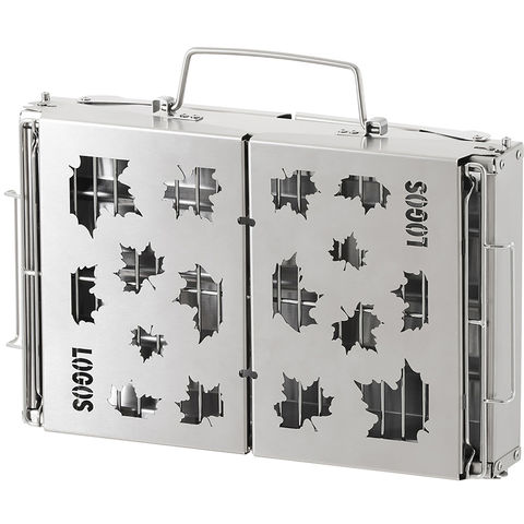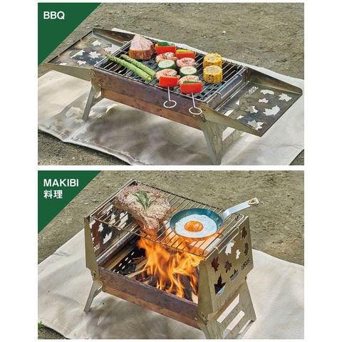 開いてセットするだけ簡単!たき火、 BBQ 、 MAKIBI 料理を 1 台で楽しめる万能ファイヤーベース.アタッシュケース型に収納できるので、持ち運びも簡単.耐久性にすぐれ、手入れしやすいステンレス素材を採用.ゴトクとしても使用できるゴトク焼網で、調理の幅が広がります.波型底の火床は本体と一体型なので、薪を直接並べてすぐ使えて便利.シンプルスマート設計のたき火台です.サイドパネルを左右に倒しゴトク焼網を火床上にセットすると、 BBQ が楽しめます.推奨燃料は、別売りの[エコココロゴス・ラウンドストーブ]が 2 個ぴったり収まります.立ち上げたサイドパネルの溝にゴトク焼網をセットすると、たき火を楽しみながら MAKIBI 料理が楽しめます. ( ※別・