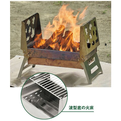 特徴:BBQ と焚火、薪火料理も楽しめます.ネジがいらない簡単セット UP .開くだけの超簡単セット UP .薄型コンパクト収納.持ち運び楽々アタッシュケース型収納.ステンレス製のストレート網は耐久性も高くお掃除も簡単.ストレート網はゴトクとしても使用できます.