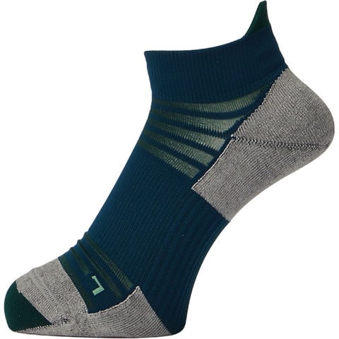 靴内の不快なムレを軽減する、ベンチレーション構造を取り入れたソックス.足の甲と指の付け根の部分を、通気性のあるボーダー状に.この部分が通気することで、ムレを軽減できるだけでなく、涼しさを感じやすくなります.足先底の内側は、パイルがある部分/ない部分に切り替えたボーダー状の構造.薄いところがあることで汗抜けがよくなり、さらに、凹凸感によりグリップ性も発揮します.つま先とかかと、甲の指の付け根部分には、グリップ力やフィット感に優れた繊維を採用.ソックスとシューズ、足のズレが少なく一体感が得られます.足裏にある縦のアーチ(土踏まず部分)の編み組織を変えて、サポート力を向上.
