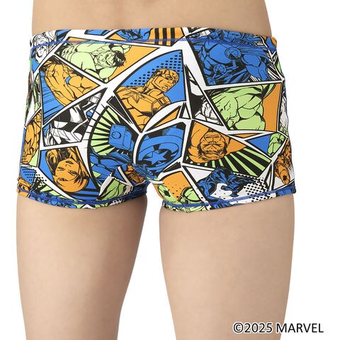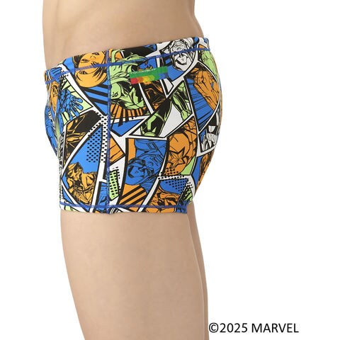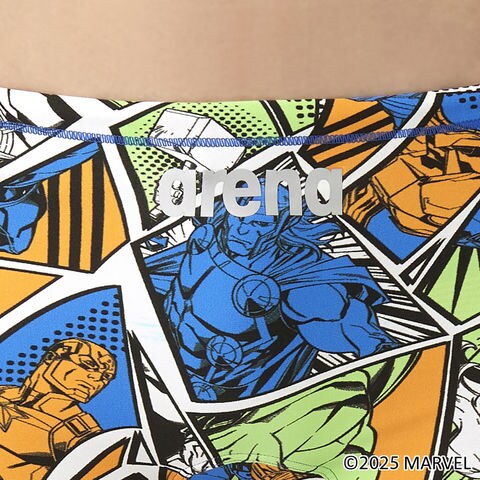 耐久性に優れた TOUGHSUIT( タフスーツ ) シリーズの MARVEL( マーベル ) デザインモデル.環境に配慮したリサイクルポリエステル素材を使用しており、塩素に強く長持ちするため、大会に向けて練習を重ねる頻度が高いスイマーにおすすめのトレーニング ( 練習 ) 用水着. 25FW は、アイアンマン / ソー / ブラック・ウィドウ / キャプテン・アメリカ / ハルク / ブラックパンサー と、 MARVEL( マーベル ) を代表するヒーローたちがアメリカンコミック調に表現されたプリントデザイン.ポップなカラーリングでトレーニングを楽しもう!水着とデザイン連動のメッシュキャップ (AS5FSC80U) やプルーフバッグ (AS5FBZ83U) とのコーディネートもおすすめ.※この製品は縫製・