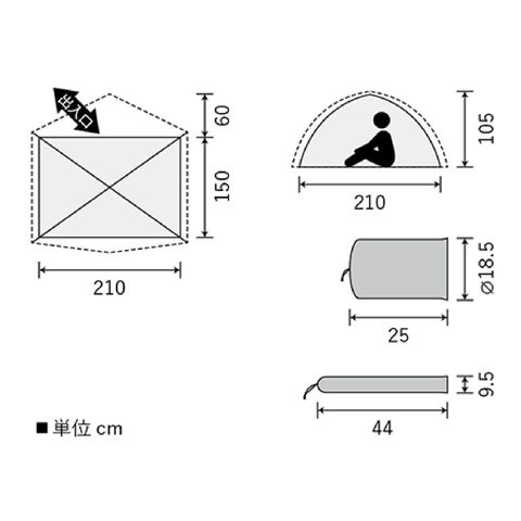 素材:フライシート /30D ポリエステルリップストップ ( ポリカーボネイト防水加工 ) 、インナーテント /30D ポリエステルリップストップ ( 通気撥水加工 ) 、本体グランド部 /75D ポリエステルタフタ ( ポリカーボネイト防水加工 ) 、ポール / ジュラルミン (DAC/NSL9MM ・