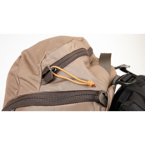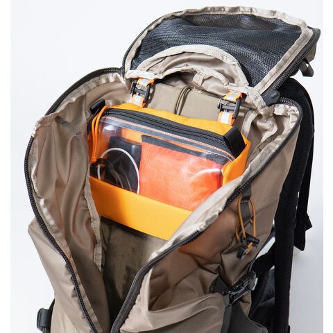 荷物の安定性を高めるサイドコンプレッション.ボトム部はディファレンシャルカット(構造に応じて内側と外側の生地を異なる形状に裁断すること)の生地を2重に使用し、耐久性を向上.ハイドレーションリザーバーに対応.上部のジッパー式コンパートメントには、小物や携帯電話、カメラなどを収納可能.