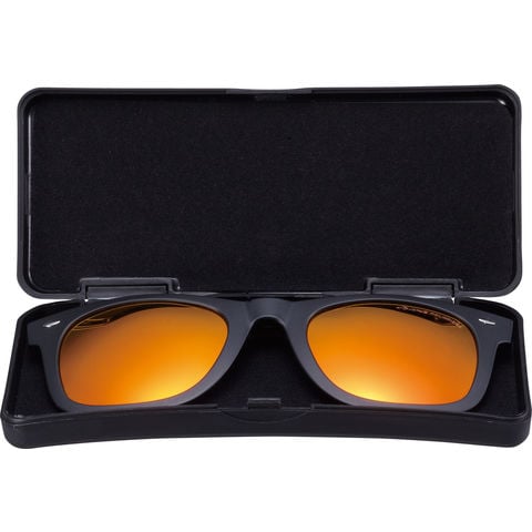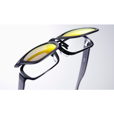 偏光レンズにオシャレなリムが付いた跳ね上げ式のクリップオングラス.デザインは流行のウエリントンを採用.実用的な機能だけでなく、見た目にもこだわったサングラスです.