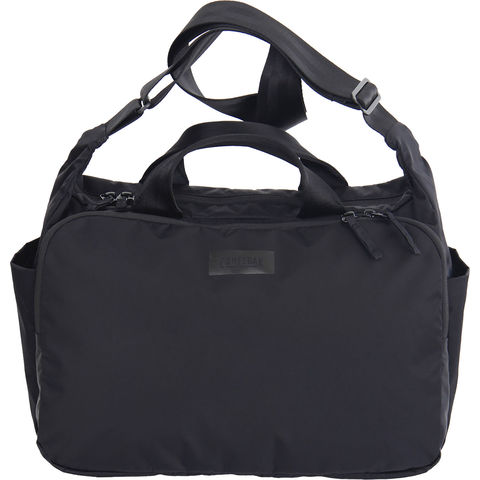 表地にリサイクルナイロンを使用した軽さが特徴のショルダーバッグ.フロントには両サイドにボトルポケットと中央に大判のオーガナイザー内蔵のポケットを配置.メインルームには13インチまでのラップトップを収納可能なPCスリーブと4つの袋式ポケット、更にはボトルが固定可能なポケットを内蔵.24SS企画から本体内部にあるボトルホールドシステムをより使いやすいストレッチ性のあるウレタン仕様へアップデート.