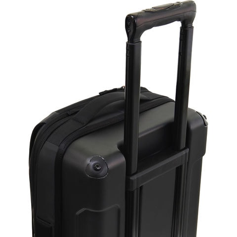 2段階の高さ調節可能なスライドハンドル.本体はボトルホルダー&メッシュオーガナイザー内蔵とPCスリーブ装備の2つの荷室に分かれています.外装のトップと左右に小物類を収納出来るポケットがあります大口径かつボールベアリングを備えたローラーを装備.転がりは非常にスムーズ.