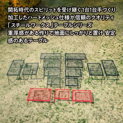開拓時代のスピリットを受け継ぐ1台1台手づくり加工したハードメッシュ仕様が信頼のクオリティ[スチールワークス]テーブルシリーズ.重厚感がある作りで地面にしっかりと置け、安定感のあるテーブル.