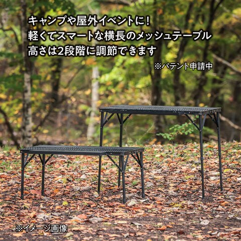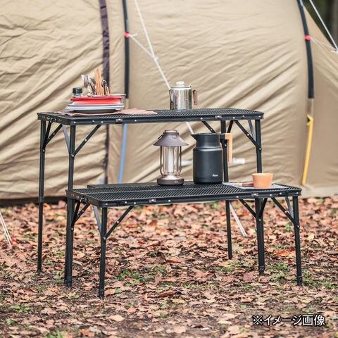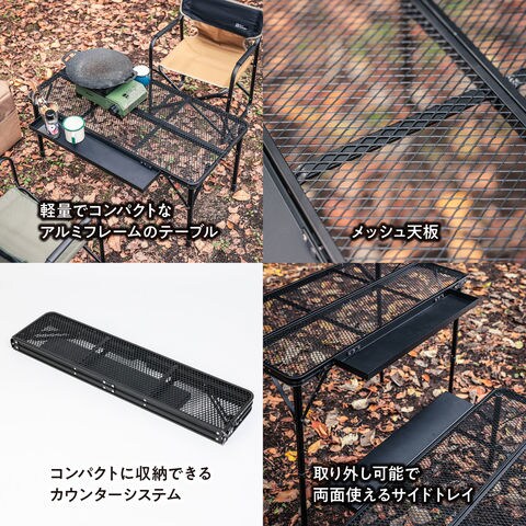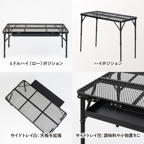 キャンプや屋外イベントに!軽くてスマートな横長のメッシュテーブル.コンパクトに収納できる、テントファクトリーオリジナルデザインのカウンターシステム.高さは 2 段階に調節できます.座ったまま作業がしやすいミドルハイ ( ロー ) ポジションと、作業用・キッチンスタンドとして便利なハイポジションに調整できます.