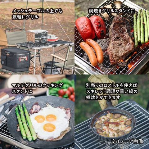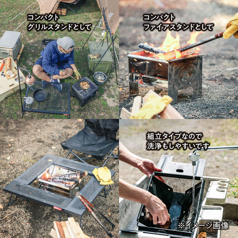 コンパクトに収納できる BBQ グリル・簡易ファイアスタンド.ソロ~グループキャンプまで楽しめ、調理から簡易式の焚火台まで幅広く活躍します.本体・専用網・キャリーバッグの 3 点セット.