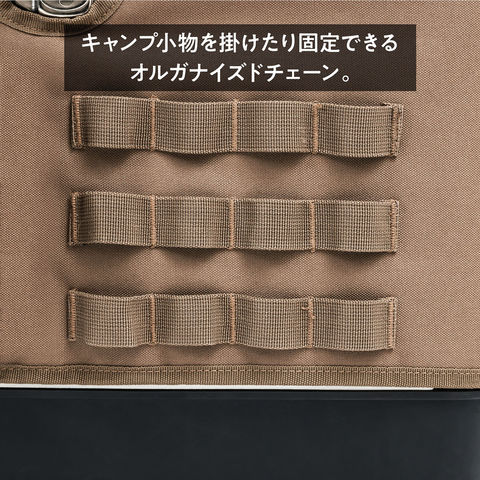 特徴:[ スタイリッシュなデザイン & ディテール ] 取り付けかんたん、カバーを付けたまま開閉可能.クッショントップは外部からの衝撃を和らげ、断熱効果も促進.通気性に優れたメッシュポケットは立体的でタオルや小物収納にも便利.シェラカップなどのキャンプ小物を掛け