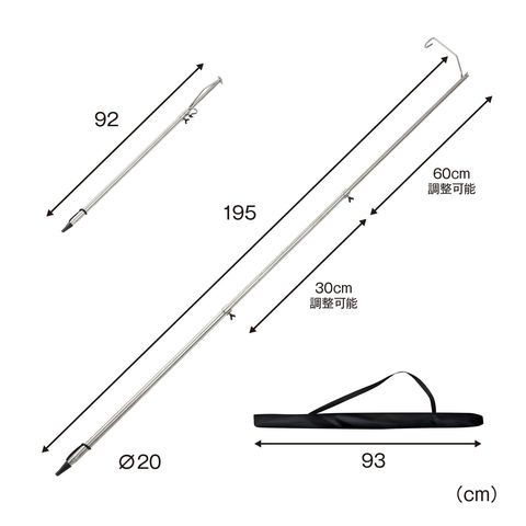 仕様:上質素材を採用した使いやすいポール:錆にも強い上質ステンレス鋼・SUS304を採用.上下2本のポールを稼働して高さの調整が可能:約92~195cm.ショルダータイプのキャリーバッグ付き.