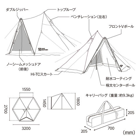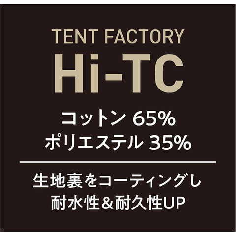 素材:フライシート・キャリーバッグ/HI-TC(コットン65・ポリエステル35+コーティング加工)耐水圧(2000mm)、センターポール/スチール(粉体塗装)3連結 径25mm、Vポール/スチール(粉体塗装)径22mm