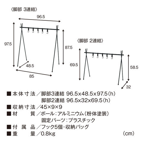 仕様:さまざまなギアをハンギングして整理整頓!直置きしたくないものを吊るす事ができる組立式ハンガー.キャンプギア・食器・着替え・タオルなど、多様に使えるマルチキャンプギアです.キャンプレイアウトをすっきり見せ、アクセントにもなるギア.フレームは軽量で水にも強いアルミ製.