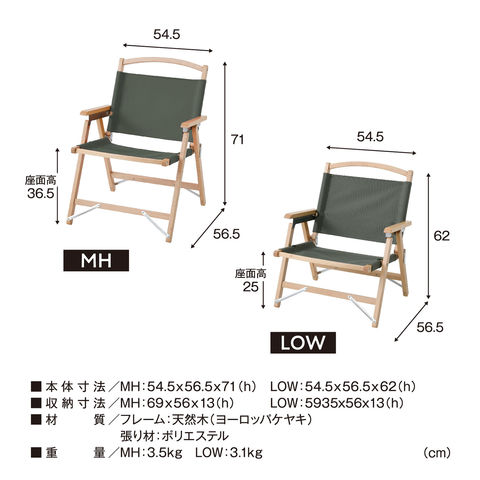 仕様:強度・風合いにすぐれたヨーロッパケヤキを採用.チェアのスタイルは組立式ではなく、シンプルな開閉式です.張り材は強度性が高いキャンバス仕上げで、座り心地もしっかりと安定しています.座面高さは、大人がゆったり座れるミドルハイ.