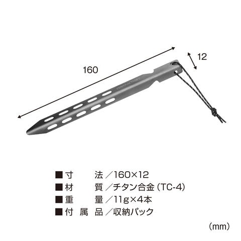 11gの軽量で堅牢・耐食性に優れたチタン合金製ペグ.差し込みし易く安定性に優れたV形状タイプ.コンパクトな160mmで荷物全体の軽量化をする各キャンプスタイルに最適(ソロスタイル・ツーリングスタイル・トレックスタイル).