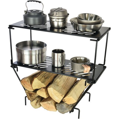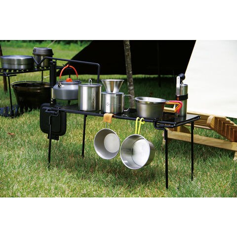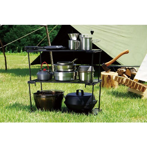 BM-283アイアンラックPLUSは単体でテーブルとして使え、BM-281やBM-282に積み重ねるとラックとして1段増やせます.上部の天板は耐荷重30kgあり、重いものはもちろんOK.アイアンなので熱いダッチオーブンなどの直置きもOKです.サイトのレイアウトに合わせて組み合わせ、構成を自由に変えられます.