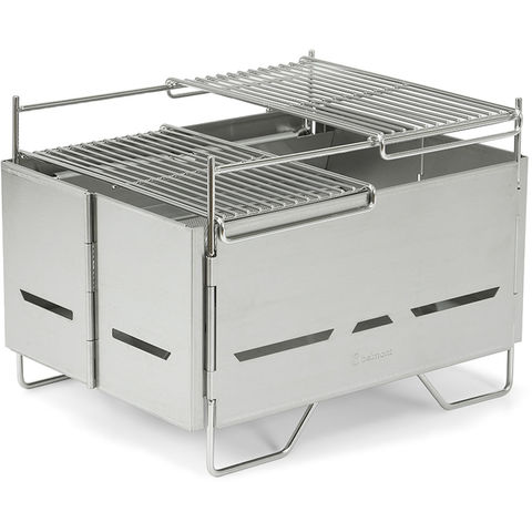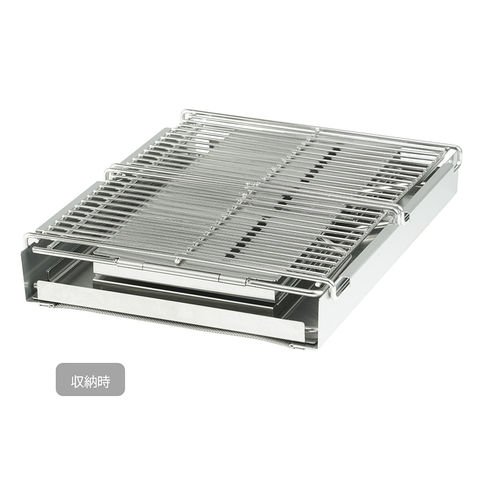ステンレス製の折り畳み卓上グリルです.焼き網は上下2段で使え、火加減の調整がしやすく、スライドさせる事で炭の継ぎ足しも簡単です.別売りのディッシュパンやアイアンプレートも乗せられるので、煮込みや鉄板料理も楽しめます.炭が落ちにくい構造で、分解してコンパクトに折り畳め、パーツごとに使用後の洗浄も楽々です.