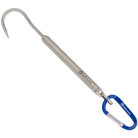 約 10KG までの魚を対象とした超小型ギャフ.サーフフィッシングなど水面が近い釣りに最適です.針の先端の角度を 2 段階にすることで先端が欠けにくく、刺さりやすい形状です.安全用のバネカバーとカラビナ付きで持ち運びに便利です.
