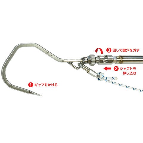 ギャフとシャフトを状況に合わせて固定したり、外してフライングギャフとして使用できるアダプター.ロック & ロック解除はワンアクションで行えます.ロックショアからボートフィッシングまで対応可能.上部ナットを回すとランディング方法をフライング式かロック ( 固定 ) 式に変更できます.素材は全て高強度・高耐食性に優れた SUS316 を採用.鍵穴構造により、力をかけてのフッキングが可能です.