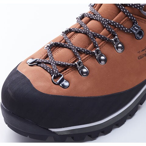 GKシリーズのトレッキング・ラインを代表する最上位モデル.2.0mm厚のヌバックレザーとハードフレームにより、重い荷物を背負った夏山縦走にも適した耐性・耐久性を実現.ライニングはクッション性のある[ゴアテックス メンブレン].ラストは足先のフィット感や踵のホールド感に優れたアドバンスラストを採用.悪路でもしっかり足を守る安定感にこだわり、縦走トレッキングにもおすすめできる一足に仕上げました.D環はマットなチタンカラーとし、側面にグランドキングの刻印を入れてシックにデザイン.履き口は上質な柔らかい本革を使用し、メンテナンスをしながら長く履き込むことで足に馴染み、愛着が深まっていくオイルレザーならではの魅力も楽しめます.
