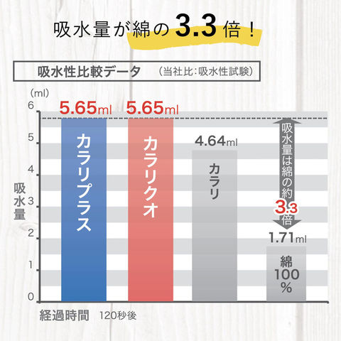 カラリよりも繊維の密度がアップしたからリプラス.吸水力を比較すると、綿のタオルの 3.3 倍、カラリよりもさらに多くの水分を吸水出来るという結果に.清潔感のあるクールな色合いで触れるとふわふわ、持つと柔らかく軽いその質感は一度使うとやみつきに.優しく包んで瞬間吸収.洗顔後やスポーツに.