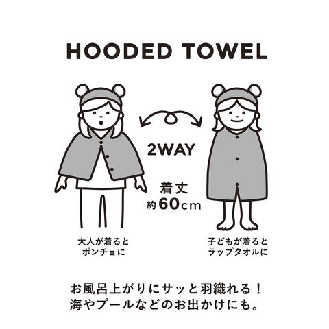 マイクロファイバーの抜群の吸水力で体表面の余分な水分をしっかり吸水.お風呂上りにサッと羽織れ、海やプールなどのお出かけにも大活躍.大人はポンチョとして、親子兼用でお使いいただけます.