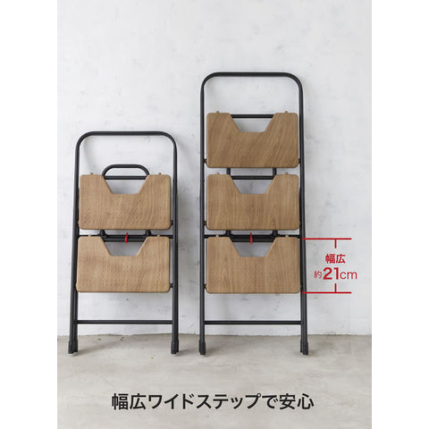 機能性・安心感・デザイン性を兼ね備えた脚立[フォールディングステップ].艶消しでマットな質感を施したフレームは楕円形になっており、昇り降りの際にはハンドルとしての役目も.2段タイプは最上段が高さ66cmあるので、カーテンの取り付けや、一人では手の届かなかった作業に最適.低めなのでお子さん用としても安心.踏み台部分は、階段のように幅が広くて安心の約21cmもある幅広ステップが特徴.滑り止め機能として全体的に凹凸があり、足を乗せる部分はザラザラしたエンボス加工が施されています.指を挟みにくく、女性でも楽々開閉できる安心構造が嬉しいポイント.