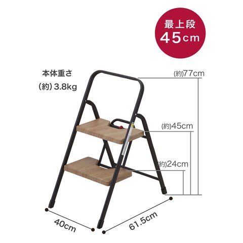 折り畳み時の厚みは、わずか約8.3cmととってもスリムなので、ちょっとした隙間に入れられて収納場所にも困りません.脚立として使わない時は、キッチンでの調理中にちょっと座れる椅子に早変わり.2段タイプは重量3.8kgと見た目以上に軽量なので女性でも簡単に持ち運びが可能です.