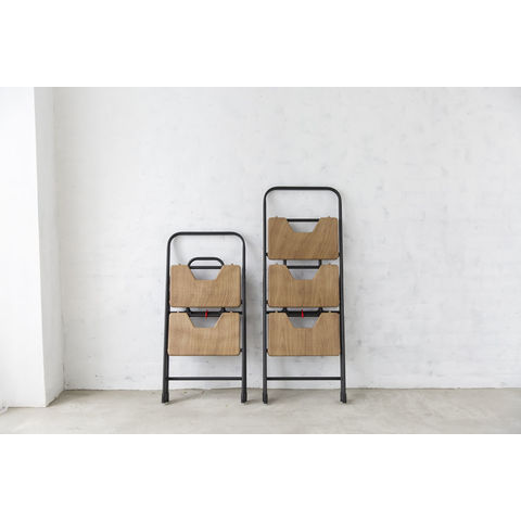 機能性・安心感・デザイン性を兼ね備えた脚立[フォールディングステップ].艶消しでマットな質感を施したフレームは楕円形になっており、昇り降りの際にはハンドルとしての役目も.3段タイプは最上段が高さ66cmあるので、キッチンの吊り戸棚への物の出し入れもスムーズ.踏み台部分は、階段のように幅が広くて安心の約21cmもある幅広ステップが特徴.滑り止め機能として全体的に凹凸があり、足を乗せる部分はザラザラしたエンボス加工が施されています.指を挟みにくく、女性でも楽々開閉できる安心構造が嬉しいポイント.フレームのハンドル部分と、踏み台についているハンドルを左右に押し広げると簡単に開きます.