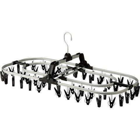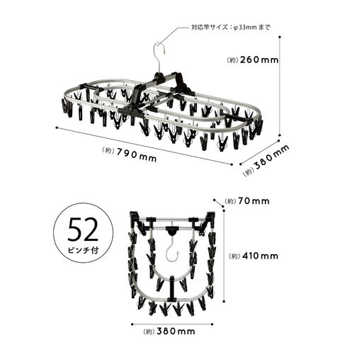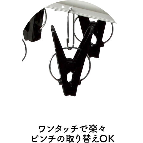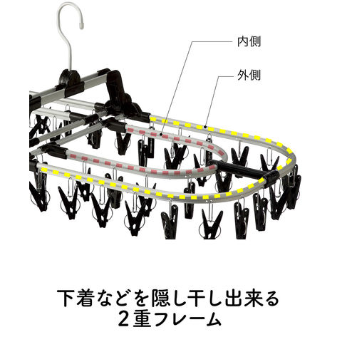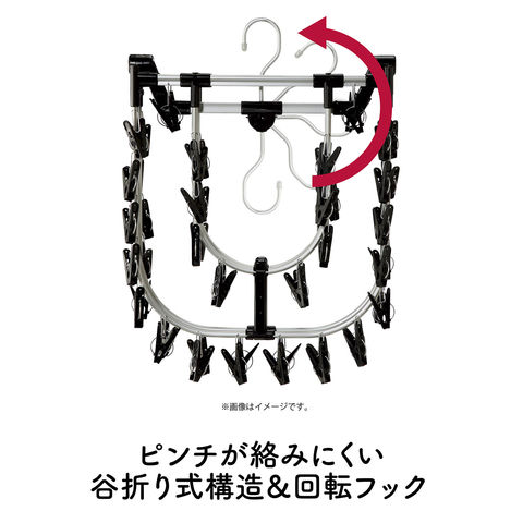 アルミ製のフックは回転するので収納時にも便利.フックが自立するので高いところに掛けやすい.下着などを隠して干せる二重フレーム.ねじれやたわみに強いリブ付きのアルミフレーム、ピンチ取付け部も金属製なので丈夫.ワンタッチで楽々ピンチ取り換えOK.ピンチが絡みにくい谷折り式の構造.