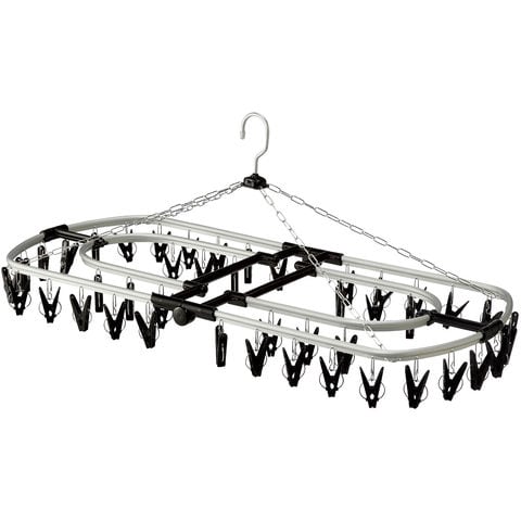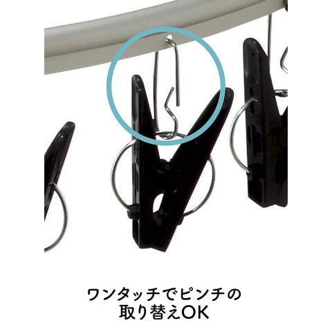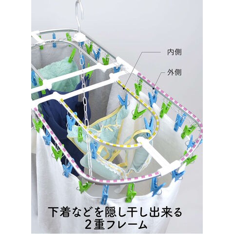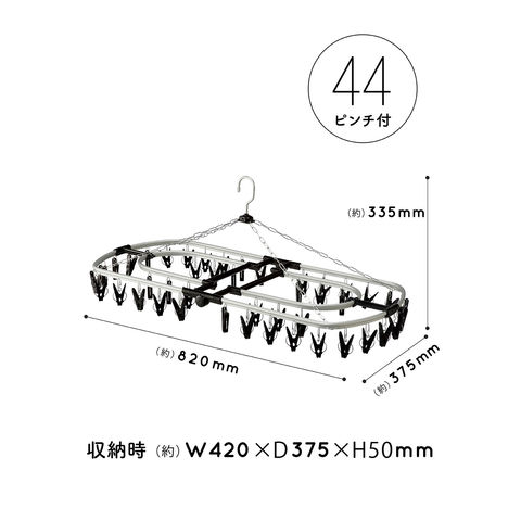 丈夫なリブ付きアルミフレーム.二重配置のピンチで隠し干しOK.アルミ製リブ+金属製リングで頑丈.軽くて丈夫、欲しい機能を満たした適度なサイズの44ピンチ.山折り式.