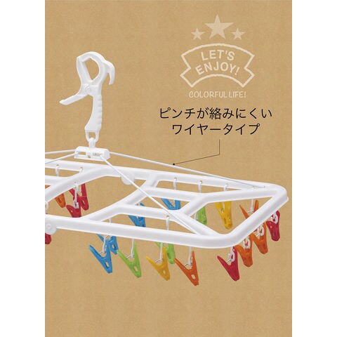 ベランダの限られたスペースでもコンパクトに収まるカラフルハンガー.グリップ式でワイヤーなので、ずれにくい.掛け間違いを防ぐカラフルピンチ.見た目の可愛さだけでは無く、同じ色同士が対になっているので、タオルなどを干した際の掛け間違いを防いでくれます.絡まりにくいピンチを使用しているので、取り扱いが楽です.キャッチフックなので、風がある日の外干しも安心です.洗濯物を取り込む際も掴むだけで簡単に取り込むことが出来ます.キャッチフック横にある小さなフックを使用すれば、物干し竿だけでは無く、ロープでも干すことが可能です.風が強い日や、取り込む際にピンチが絡むのを防止してくれるワイヤーフレームなので、快適にお使い頂けます.
