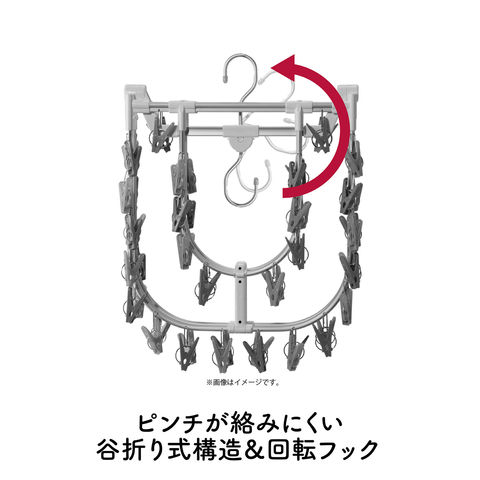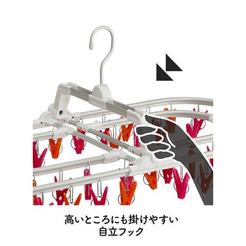 アルミ製のフックは回転するので収納時にも便利.フックが自立するので高いところに掛けやすい.下着などを隠して干せる二重フレーム.ねじれやたわみに強いリブ付きのアルミフレーム、ピンチ取付け部も金属製なので丈夫.ワンタッチで楽々ピンチ取り換えOK.ピンチが絡みにくい谷折り式の構造.