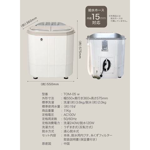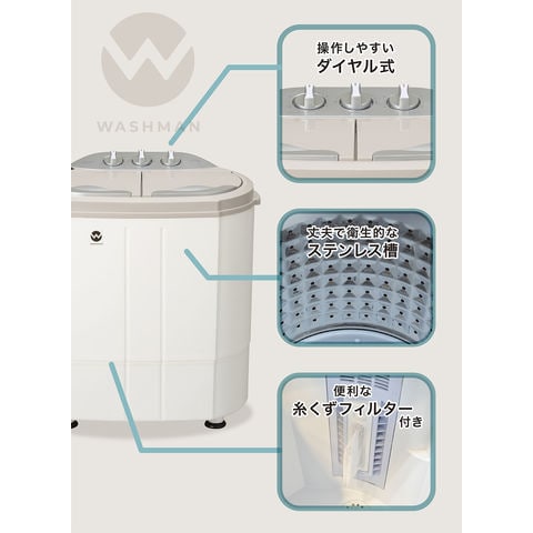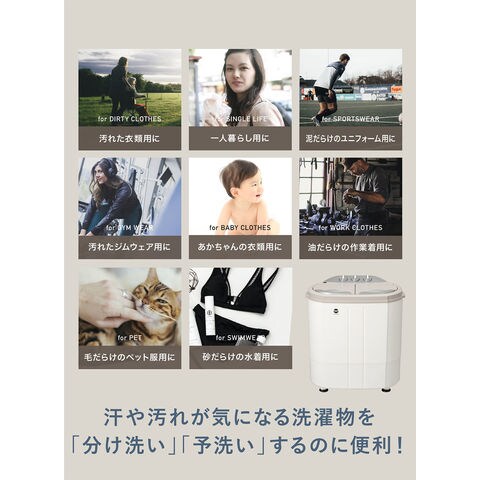 分け洗いや予洗いをこの一台で![洗濯]と[脱水]が出来ます.電源(コンセント)と、水道(給水)、排水できる場所があればどこでも設置できる.※屋内でご使用ください.洗濯槽は[抗菌仕様].瞬時反転方式でしっかり洗浄.ダイヤル式だから操作がとっても簡単.ステンレス脱水槽.泥だらけのユニフォーム用に、汚れた衣類用に、優しく洗いたい赤ちゃんの衣類用に、毛だらけのペット服用に、ホコリだらけ体操服や上履き用に、砂だらけの水着用に、学生や社会人の一人暮らし用に、泥だらけの作業着用に.洗濯中のゴミをキャッチするゴミ取りネット付き.※高温多湿な場所、火気付近、直射日光にあたる場所、つり戸棚等の高い場所に保管しないでください.