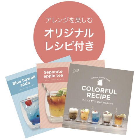 飲み物を注いで楽しむ耐熱アニマルグラス.飲み物を入れると動物がはっきり現れる2層構造.表面に水滴がつきにくく、テーブルを濡らしません.電子レンジでも使えるのでホットドリンクも楽しめる.ゼリーやプリンなどデザートグラスとして使うのもオススメ.いつもの飲み物を注ぐだけで映えるドリンクに!電子レンジOK!熱湯OK!食器洗浄器OK!オリジナル5レシピ付き.