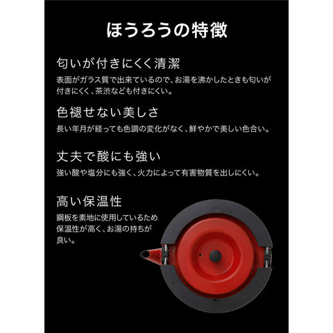 優れた耐久性、耐熱性、耐酸性、高い保温性.匂いが付きにくく清潔.色褪せない美しさ.琺瑯は金属の表面にガラスを高温で焼きつけたものです.抜群の耐久性、耐熱性を発揮するとともに耐酸性に優れているため、毎日使うキッチンウェアとして長く愛されています.分厚い素地と内外部を完全にカバーした熱伝導率の低い琺瑯層のため、優れた保温性を発揮、お湯のもちも良好です.日常の台所用品として匂いがつきにくいことは大事なことです.表面がガラス質で出来た琺瑯は匂いが付きにくく、滑らかで洗いやすく、清潔さを保ちます.ガラス質なので着色が自由自在.鮮やかで美しい色合いと光沢が楽しめるとともに、長い年月が経っても色調の変化はほとんどありません.